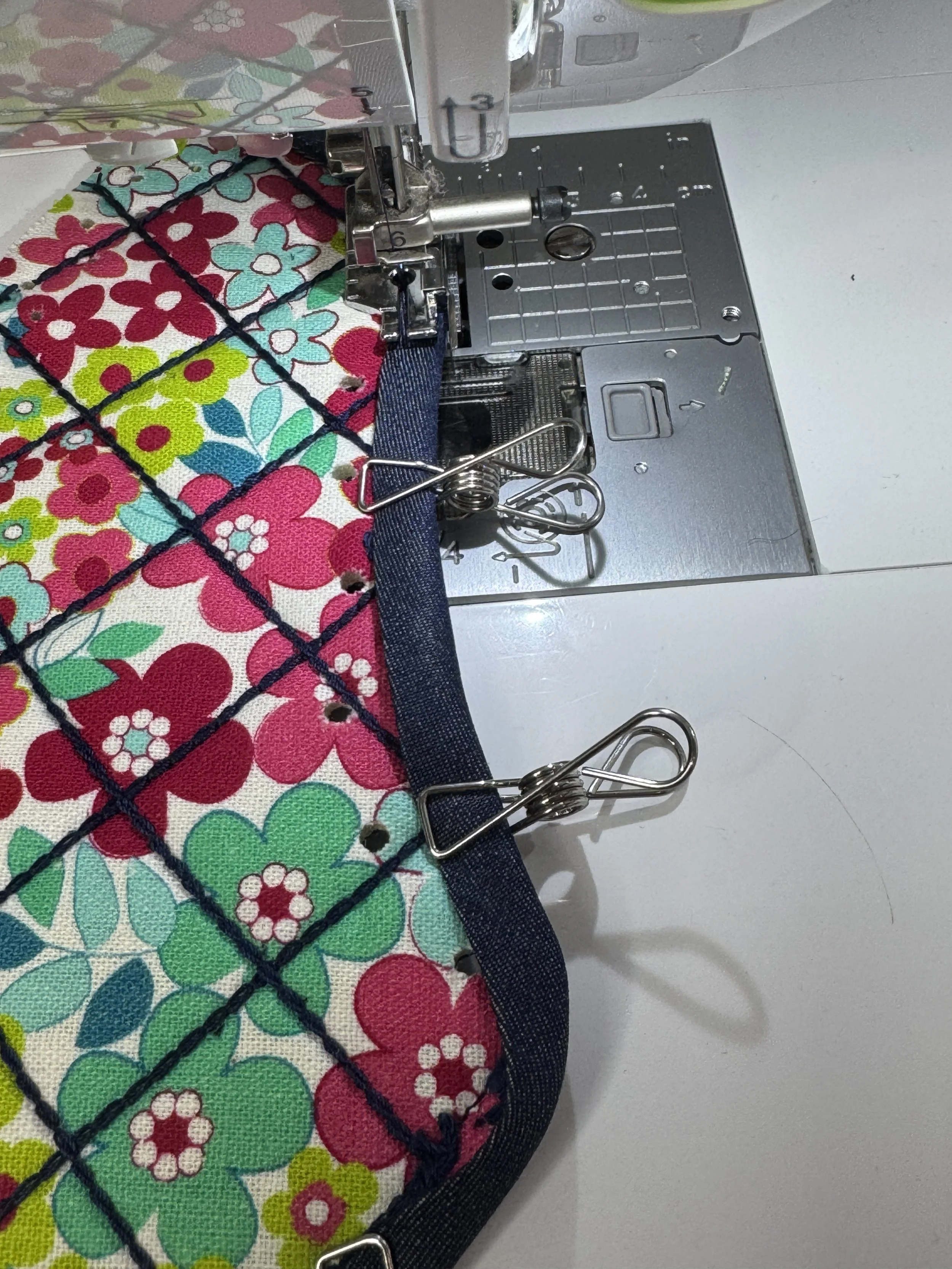 The first step was to prepare the fabric, the fabric needed to be quilted before cutting out the pieces, I used the Matilda’s Own double sided fusible foam, it was so easy fusing the fabric to the foam and stitching - no need to pin through the layers. I set my coverstitch machine up with navy WonderFil 12 weight Spagetti thread in the chain looper and navy designer thread in the needle. I had a size 14 needle in the centre needle position and a stitch length of 3. Drawing a 1” grid on the denim side made it easy to keep my quilting straight, I do actually have a quilting guide for my machine which I have used on the Ovation which is currently away getting a well earned rest and service. I’m guessing the screw that holds the guide in place is still in the Ovation, I need to order one for the Primo, this would have saved me the time of ruling all the stitching lines.