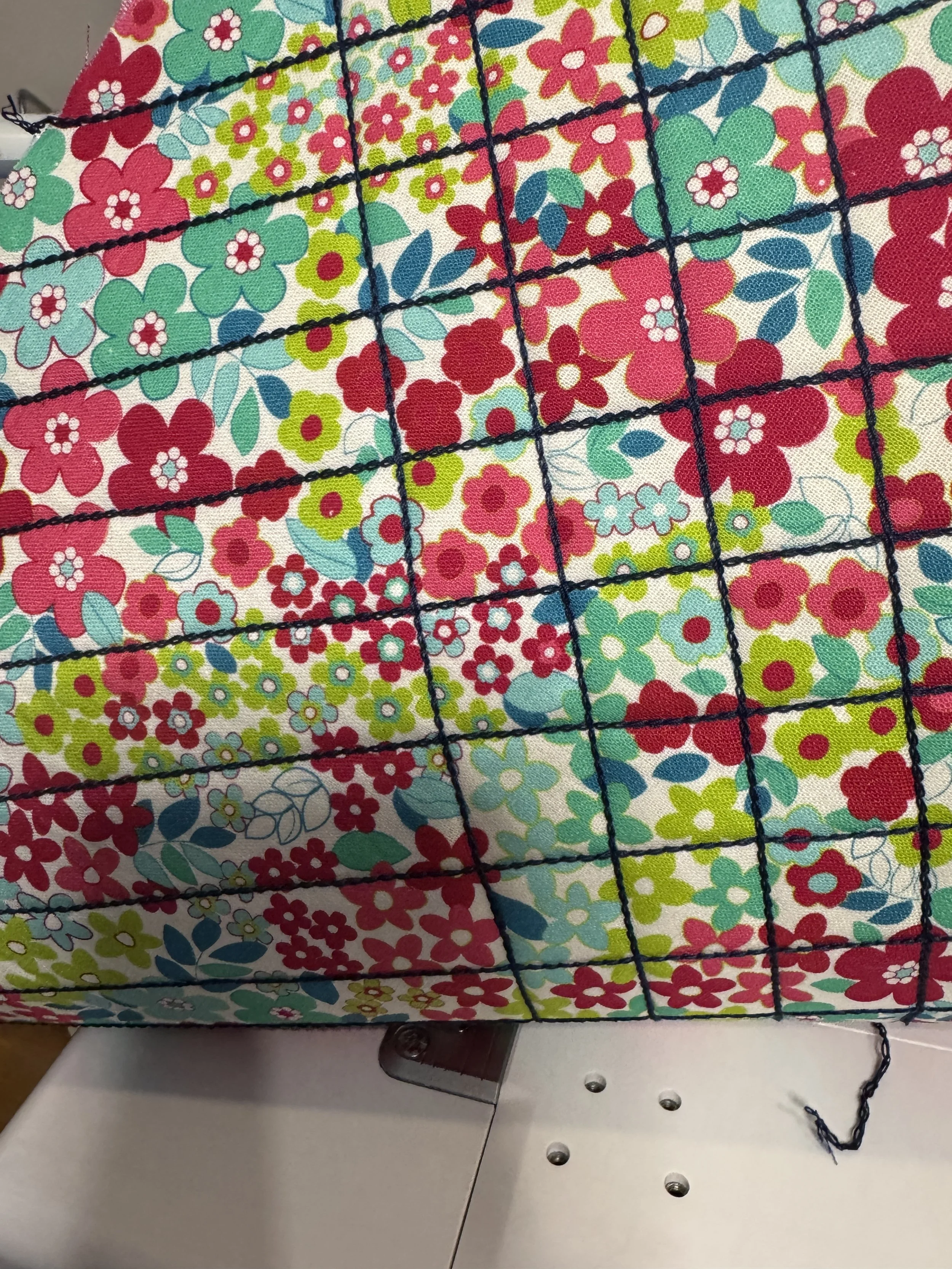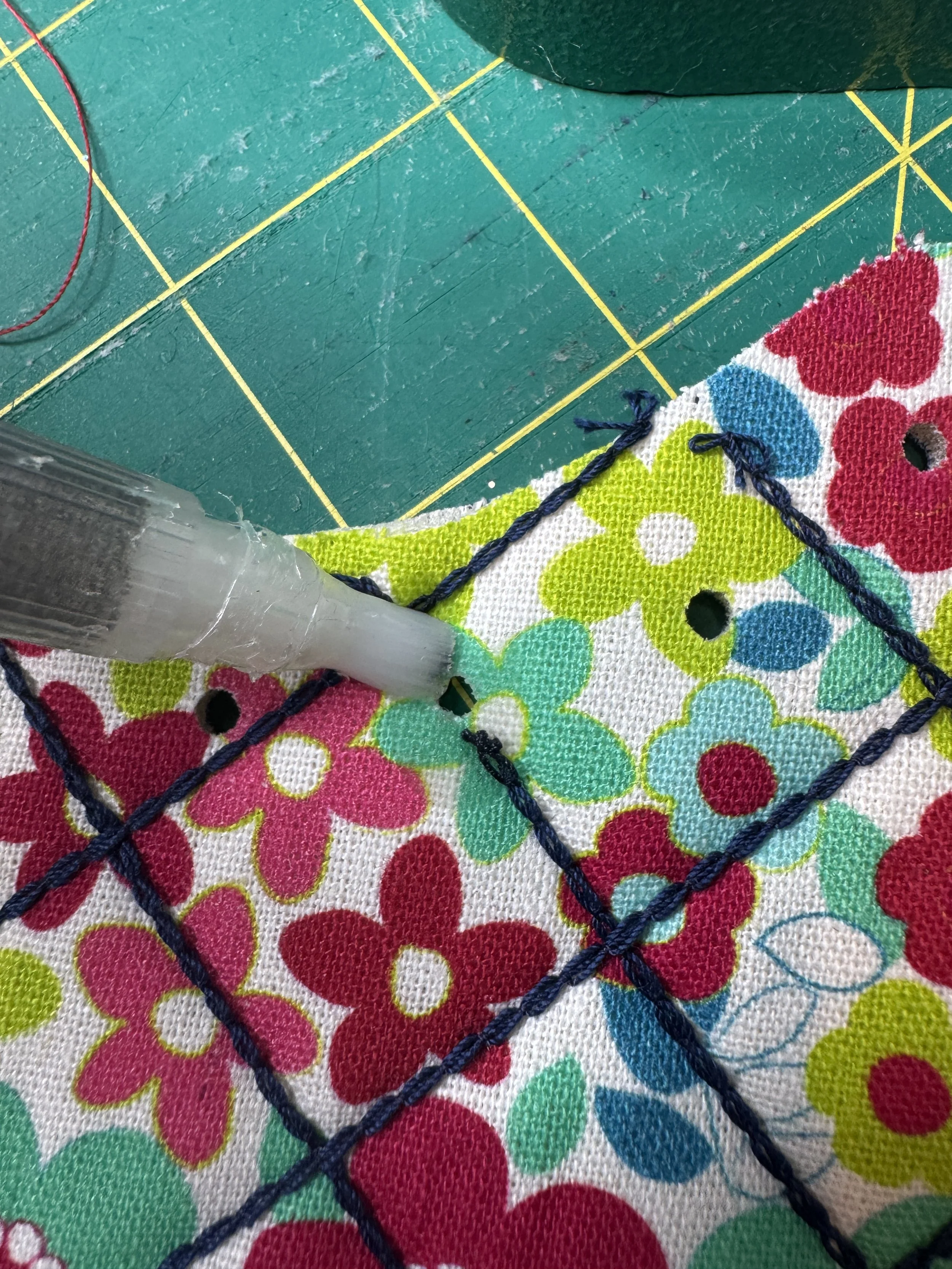 Once I removed the pattern pieces I heard my teaching voice in my head “chain stitch unravels easily from the end that you have finished stitching if the looper thread gets free”. In some places where the holes had punched, it had cut through my quilting stitches - something I hadn’t anticipated! *Note the above photo. I used fray stop on all these areas and in some places tacked down the ends to be extra secure.