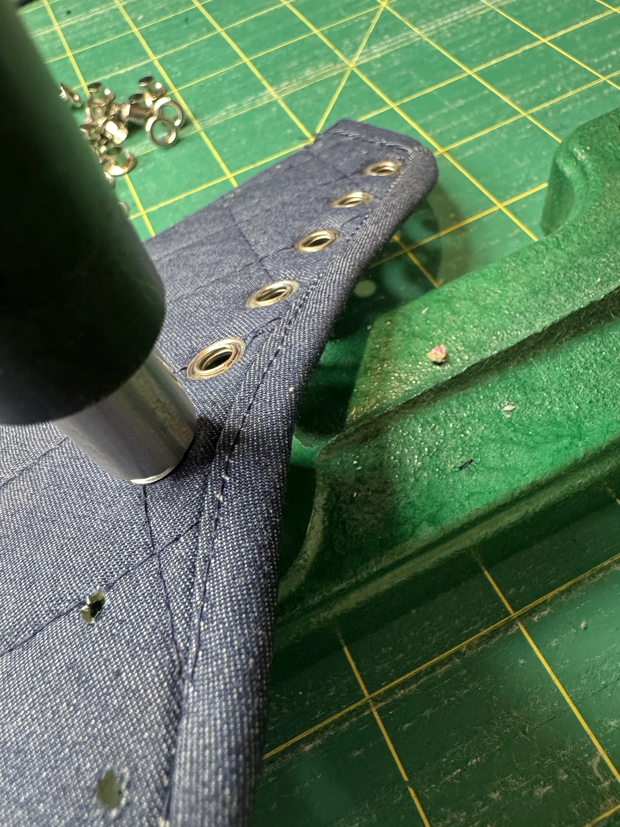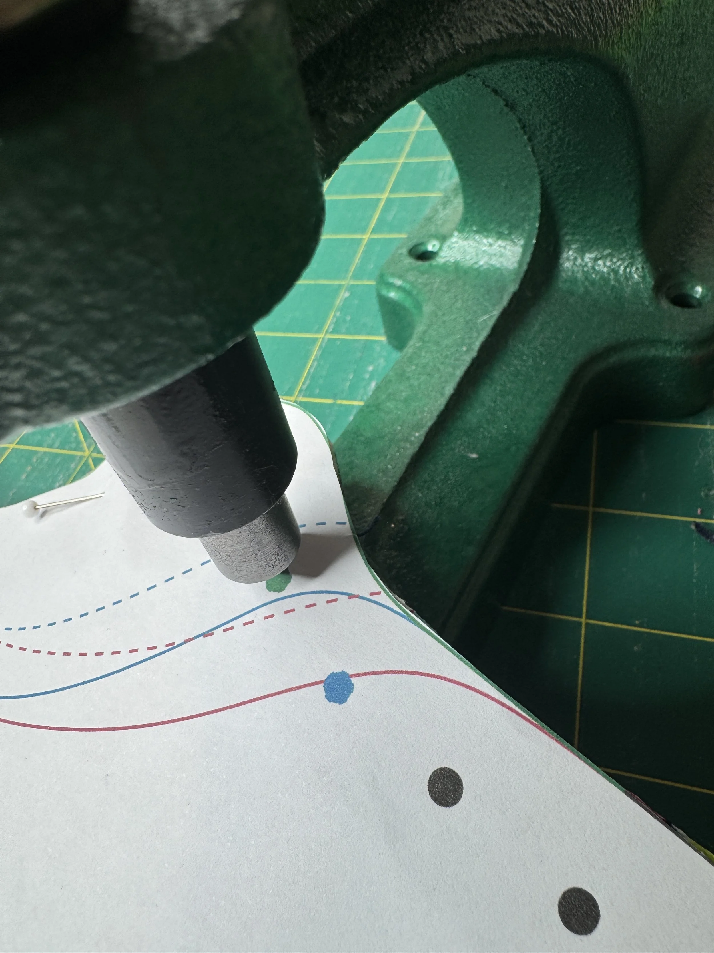 The next step is to punch the holes, Leesa at Sneaker Stitch has the dyes for the Kam press available or the tools to do it by hand, you dont need a press to make these sneakers. The holes for the grommets are larger than the holes to stitch the pieces to the soles. I love the method of punching through the pattern pieces to ensure the placement is accurate.